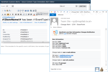 HarePoint Custom Alerts for SharePoint allows you to create custom alerts for every SharePoint list, document library or content type on your site. The appearance of email alerts can be fully customized, you can select which fields to display, customize links, change field order and layout, brand the email and track list item changes. Any site owner can create alerts for their site as farm admin permissions are not required. HarePoint Custom Alert is fully compatible with Microsoft SharePoint 2010 and 2013.