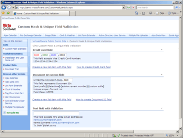 Virto Custom Mask & Unique Field Validation Web Part provides SharePoint users with features for data entry, and is fully compatible with both Microsoft SharePoint 2007 and 2010. First, it enables the creation of pre-defined masks for entering data of a specific type and, second, it allows selected fields in SharePoint lists to contain unique values only. SharePoint lists often contain information such as credit card numbers, phones, addresses etc. With Virto Custom Mask & Unique Field Validation Web Part entering this data becomes fast and convenient for users.